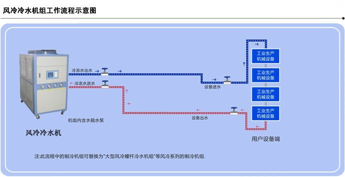 風(fēng)冷型冰水機(jī)具有安裝方便簡(jiǎn)單,移動(dòng)方便。但噪音比較大。效率比水冷型冰水機(jī)略差。